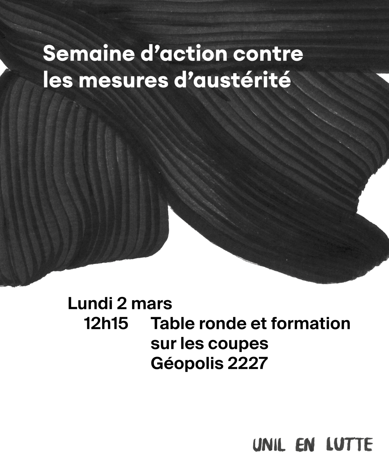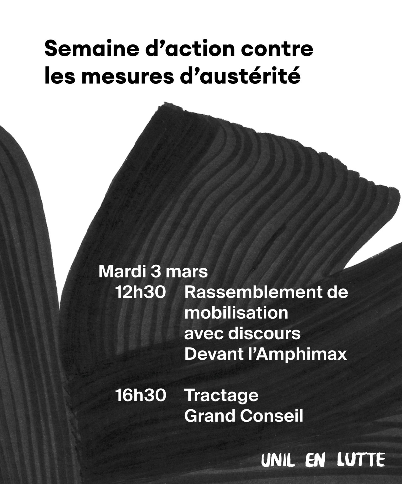 À partir du 2 mars, le Conseil national à Berne discutera du projet déjà voté par le Conseil des États qui prévoit de réduire de plusieurs centaines de millions les subventions de nos universités et hautes écoles suisses. L’UNIL peut aussi massivement être touchée par ces coupes sous forme de hausse des taxes d’études pour ses étudiant·e·x·s, suppression de postes d’assistant·e·x·s et de chercheur-euse·x·s et de leurs projets. Cela peut avoir un impact direct sur tes projets d’études !